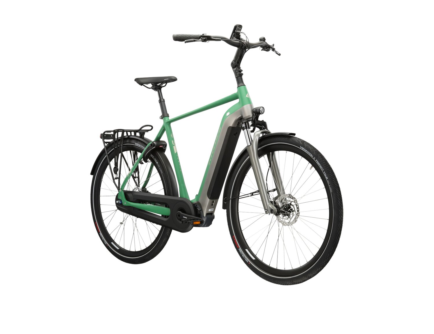 Rama roweru wykonana z aluminium charakteryzuje się schludnym wyglądem dzięki starannie poprowadzonym wewnętrznie kablom. Delikatnie opadająca górna rura ułatwia wsiadanie, co jest szczególnie ważne dla osób o różnej sprawności. Dodatkowe akcesoria, takie jak błotniki, bagażnik oraz oświetlenie, dbają o użytkowników, zwiększając komfort i bezpieczeństwo podczas podróży. Rower został również zabezpieczony blokadą tylnego koła AXA Victory, co zmniejsza ryzyko kradzieży.